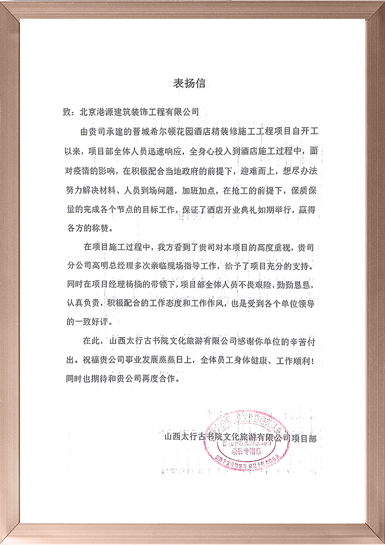 2022年9月,希尔顿集团宣布晋城古书院希尔顿花园酒店正式营业。山西希尔顿花园酒店是山西华谊兄弟星剧场的配套项目,是山西省第一家希尔顿集团酒店。项目由晋城古书院文化旅游有限公司投资兴建,由希尔顿集团运营管理,室内全部区域的精装修工程由港源装饰负责施工。