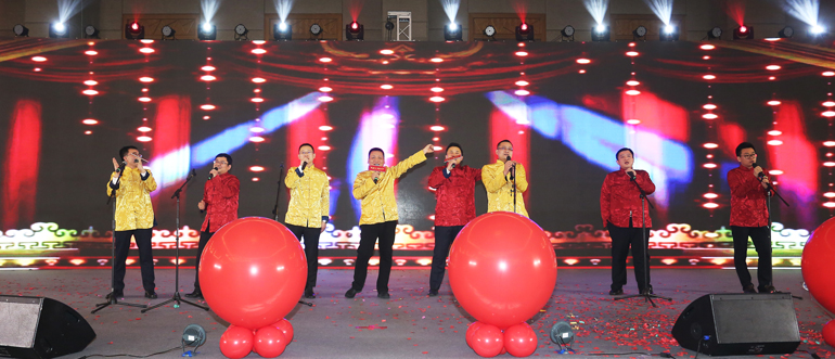 在歌曲串烧《燃烧吧2019》中的最后一首曲目——《歌唱祖国》中,符剑平总带领全体高管上台,掀起了全场大合唱。歌曲的最后,在“2019,势不可挡”的高呼声中,“聚势而上,敢为共行”2019港源装饰年会圆满闭幕!