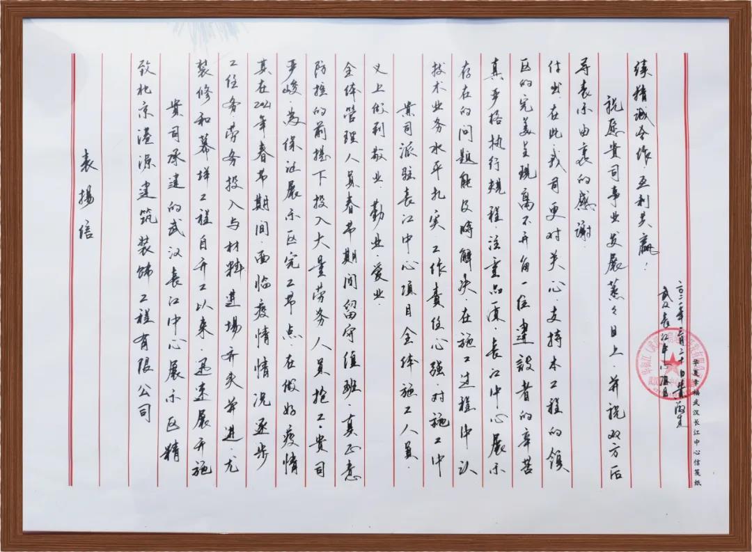 在滨江艺术展厅建设期间,港源装饰项目团队的施工工艺、工程质量及施工进度均受到业主的高度评价,不仅连续荣获“优秀项目经理”、“优秀供应商”等奖项及表彰锦旗,还获得了业主领导亲笔书写的表扬信。在这封珍贵的表扬信中,业主以“敬业、勤业、爱业”对港源装饰项目团队做出高度评价,并对港源项目管理人员扎实的技术水平、极强的品质意识致以由衷赞扬。