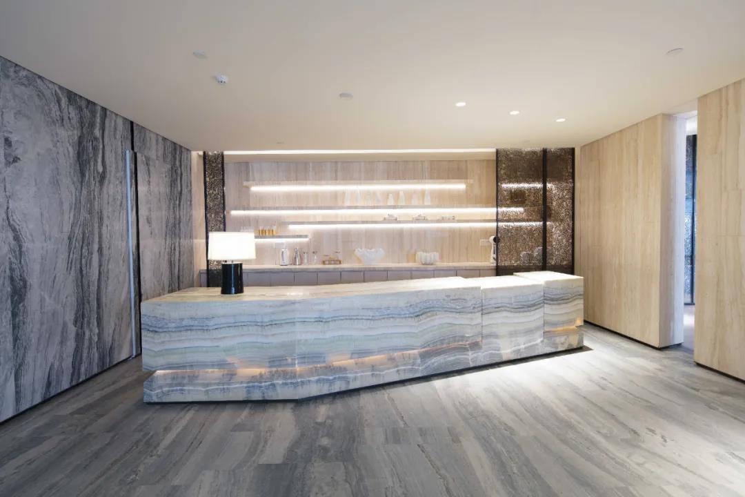 为了实现设计师的美学初衷,完美还原空间斜面造型的线条韵律,港源装饰项目团队从材料甄选、放线施工、对缝铺装、不锈钢格栅、无框灯具等节点展开详细策划及精密计算,通过材料小样、工艺小样、实体工艺样板等120余次打样确认,最终完美实现设计初衷。特别是在面对全部石材错拼施工的墙地面时,诺大的空间没有相同尺寸、相同纹理的石材,港源装饰项目团队与甲方管理团队、程绍正韬设计团队密切配合,将石材下单图以最短时间绘制并确认,按照预设编号及纹理铺装,最终达到了“顺纹不对纹”的空间美学效果,完美呈现出石材本体的自然之美。