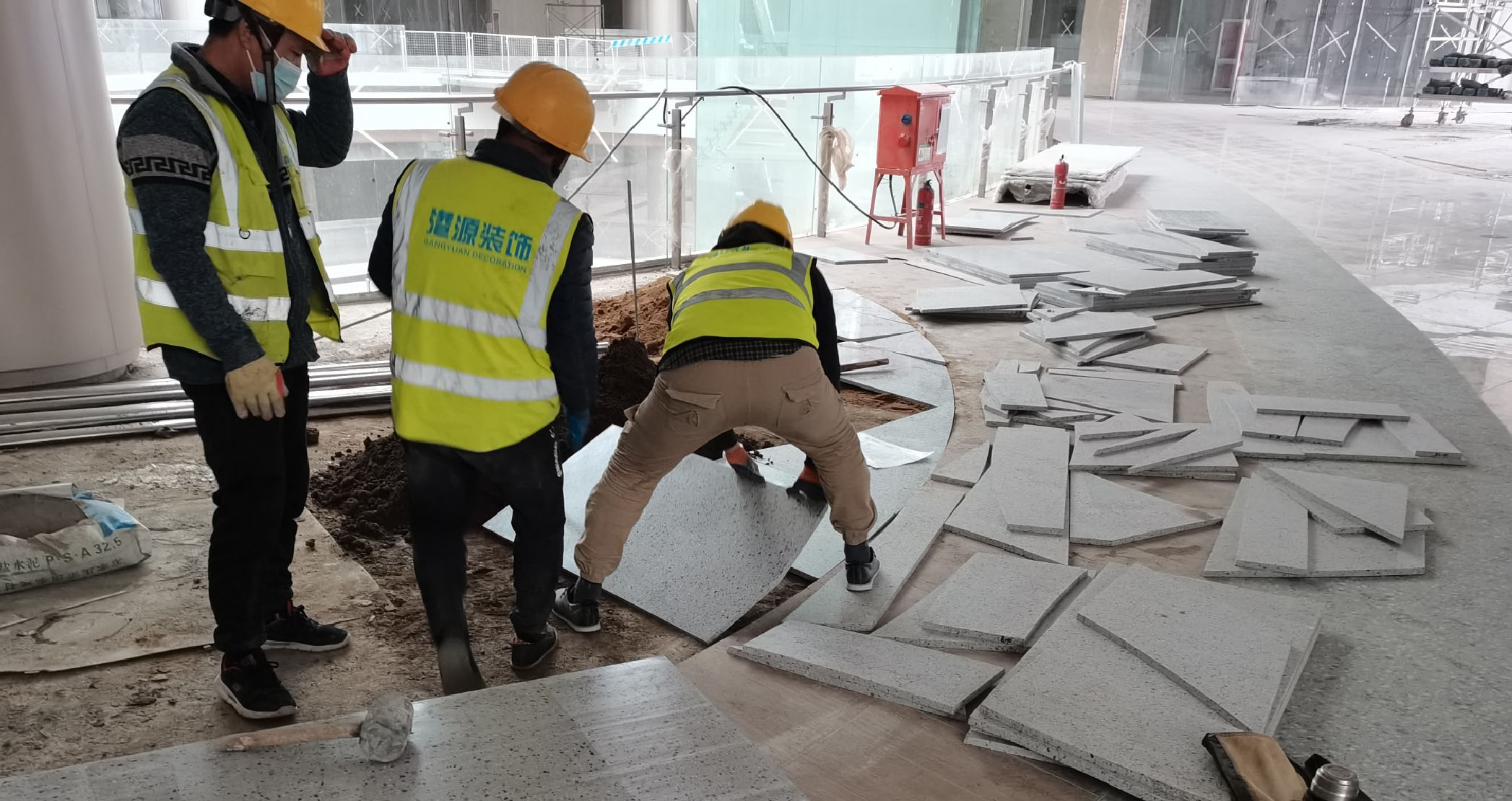 ↑每层楼梯口的地面拼花均由不规则的水磨石、木纹砖拼接而成,每块材质的造型及弧度都不相同,港源装饰项目团队采用碎片式拼接的精细施工方式解决此项难题。