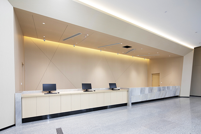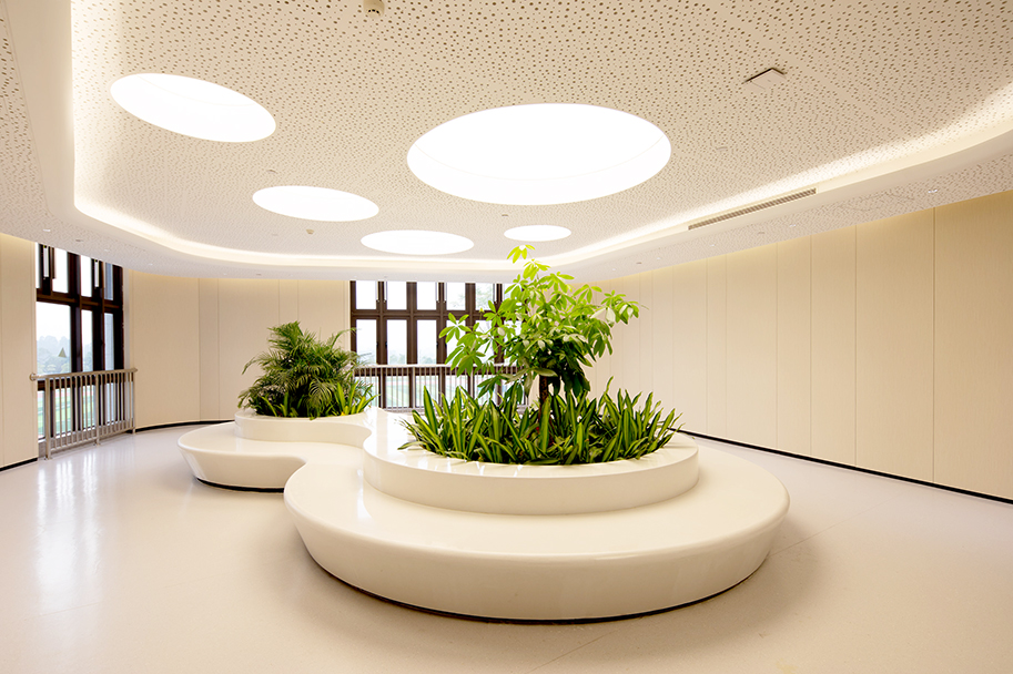 校园环境关乎着每一位孩子的身心健康,因此,学校建设更应严格强调工程质量的安全环保。对于这一方面,港源装饰与甲方的意见高度统一,因此仿木纹金属墙面便成为亮亮中学室内环境的重要材质。仿木纹金属墙面不仅有极佳的质感,而且具备环保、防潮、抗菌等优势,但金属材质易变形的属性也同时存在。为了坚持环保优先原则,港源装饰团队反复论证,决定增加轻钢龙骨等基层处理工序来保障金属墙面的平整度及垂直度,并且达到了易于拆装、降低维护成本的目的。