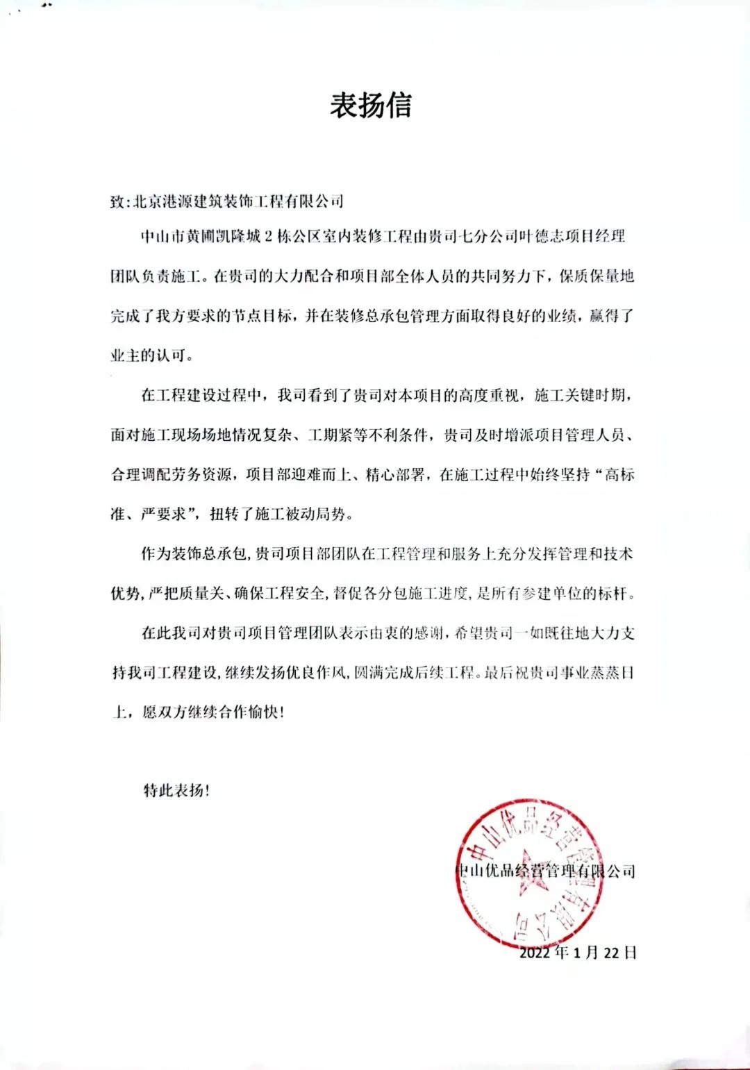 一封封表扬信、感谢信,是对港源品牌的认可,也是对全体项目管理人员付出的肯定,更是鞭策我们不断提高服务质量的动力。在今后的施工管理服务中,北京港源将坚持以“让客户更满意”为宗旨,以适应客户的多样化需求。